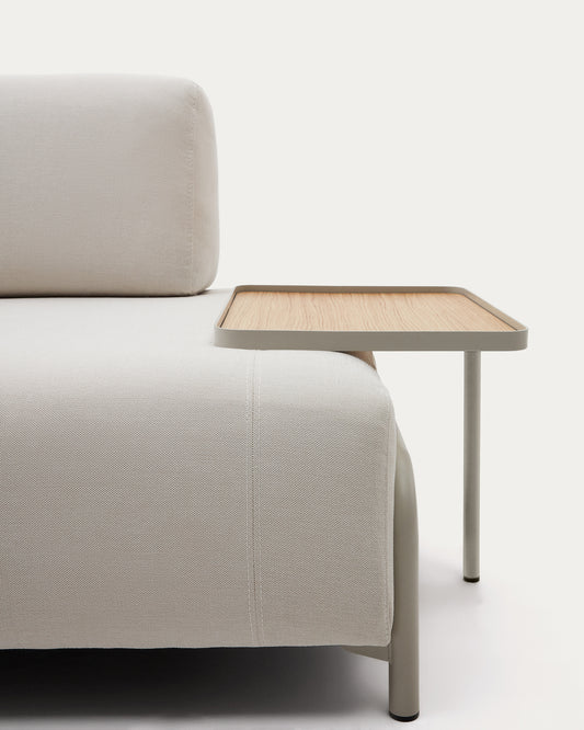 - 3-seater sofa with large tray made with natural oak veneer and beige metal structure.