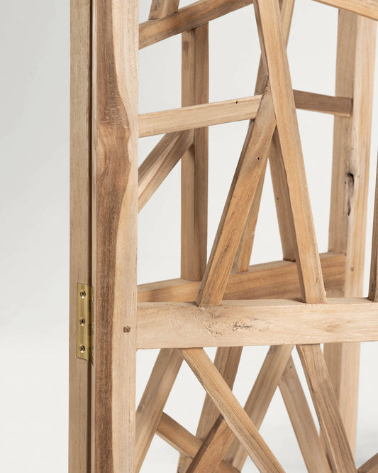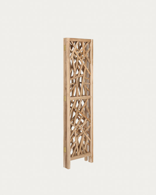 Le paravent Avaline est totalement fait en bois de teck recyclé d'origine indonésienne, concrètement de l'île de Java. Chaque partie de cette pièce est exclusif, même ses imperfections les plus parfaites. Il résiste aussi au temps qui passe. Comme il est en bois massif, ses veines et sa tonalité son elles-aussi uniques. Pour créer les trois panneaux, les morceaux ont été assemblés entre eux, un par un, pour réaliser une mosaïque totalement faite à la main. Un élément naturel et authentique.