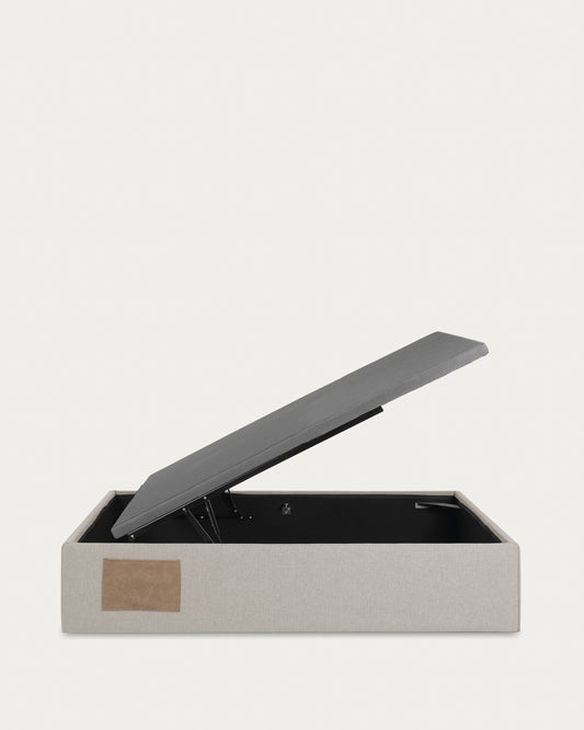 - Sommier coffre pour matelas de 150 x 190 avec structure en bois et mousse de polyuréthane, couvercle relevable avec piston à gaz.