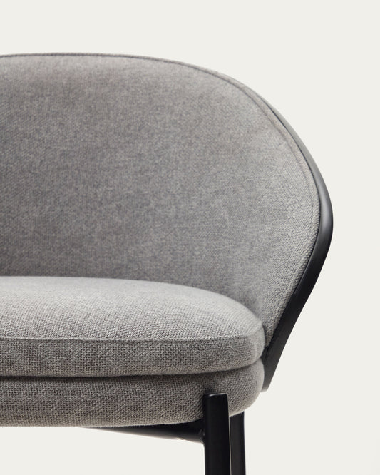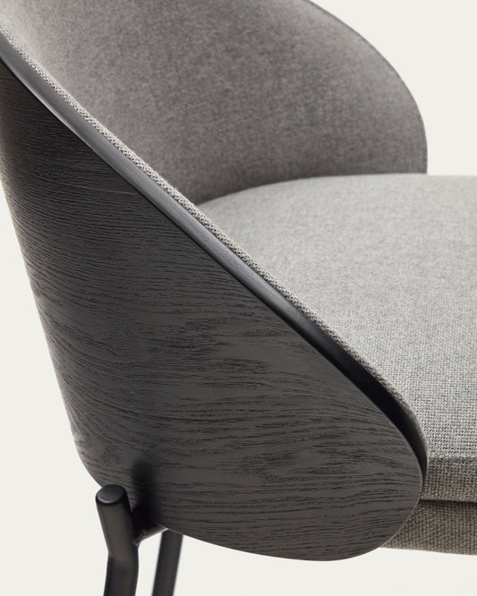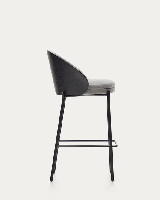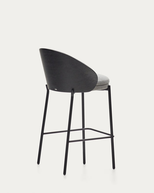 Eamy stool light grey chenille and ash wood veneer with a black finish and black metal, 65 cm