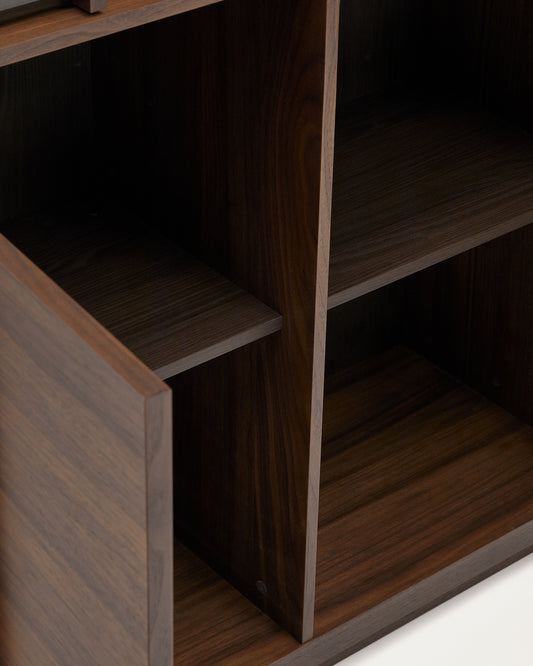 - Top part with tempered glass doors and shelves and the lower part with doors and shelves in a walnut veneer.