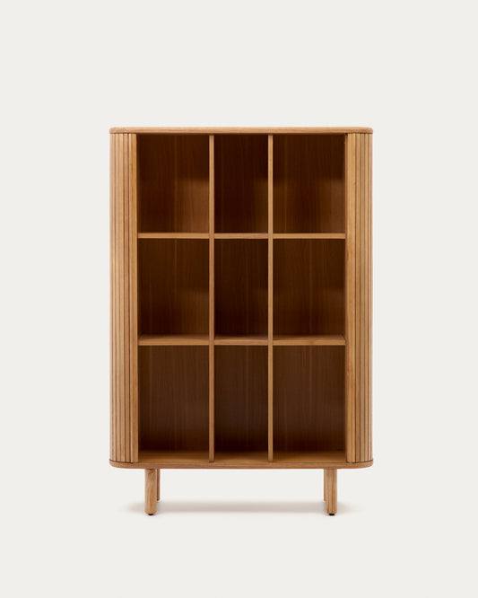 - 2 portes coulissantes au style volet roulant faites en lattes en bois qui maintiennent à la vue les étagères centrales.