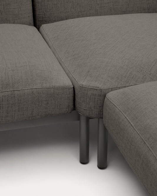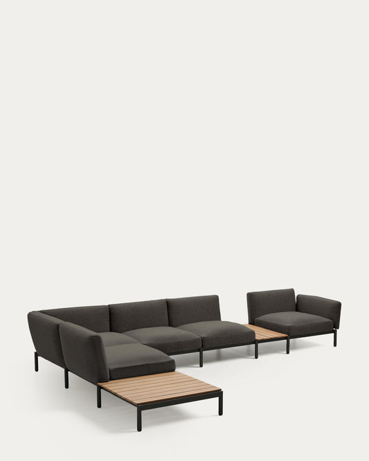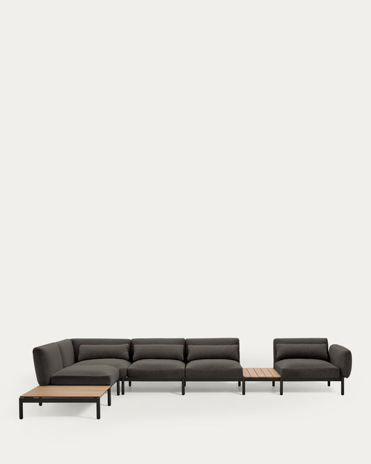Canapé d’angle modulable d'extérieur Sorells 5 places revêtement gris et aluminium gris accompagné de tables en teck 277 x 446 cm FSC 100 %