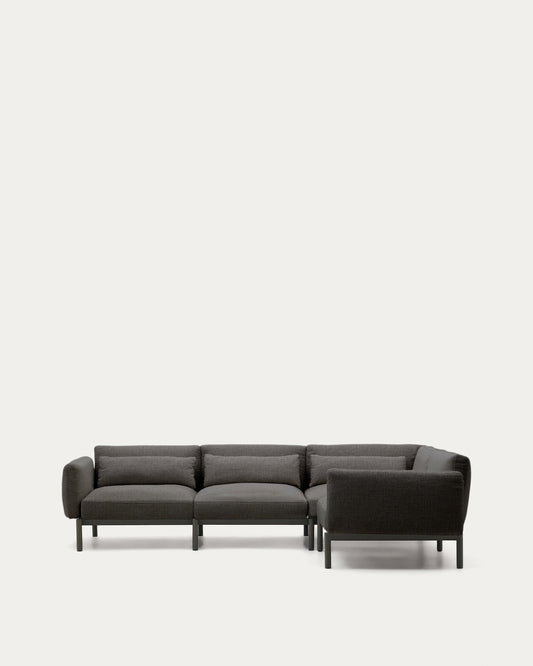 - Canapé d’angle modulable d’extérieur Sorells 5 places tapissé en gris foncé et structure en aluminium gris.