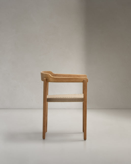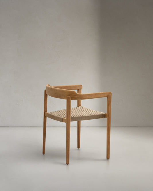 - Chaise empilable en bois de teck avec accoudoirs. Assise en corde résistant aux rayons UV et tressée à la main.