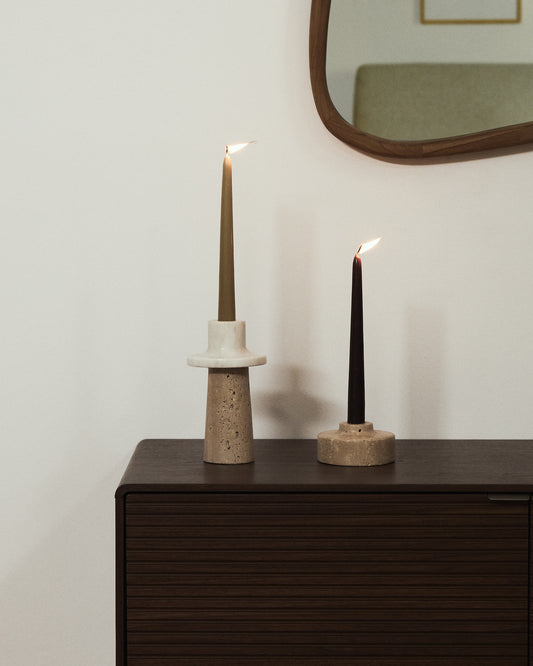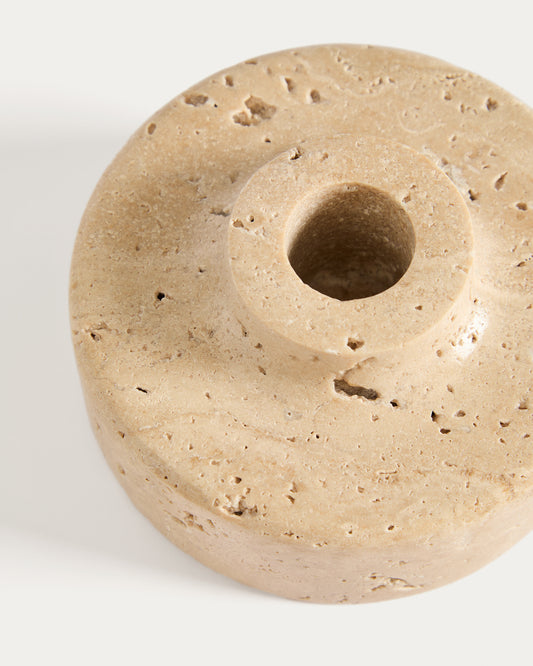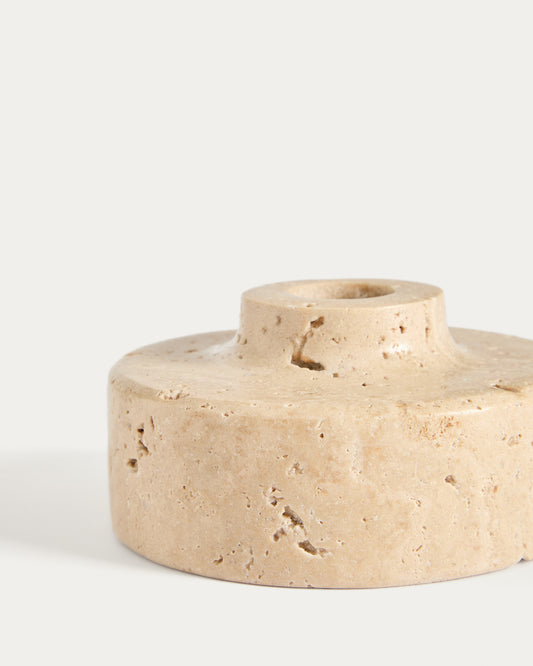 Ce chandelier en travertin se distingue par sa texture unique, qui présente de fines irrégularités et des tons chaleureux. Chaque pièce possède ses propres nuances et veinures qui la rendent unique. Son poids et sa solidité offrent une base stable pour la bougie, tandis que ses lignes épurées et ses proportions harmonieuses en font un élément décoratif polyvalent, capable de s’intégrer dans différents espaces de la maison.