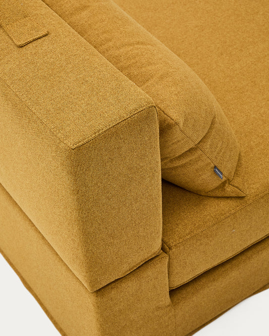 - Chauffeuse revêtue de tissu structuré de couleur moutarde.