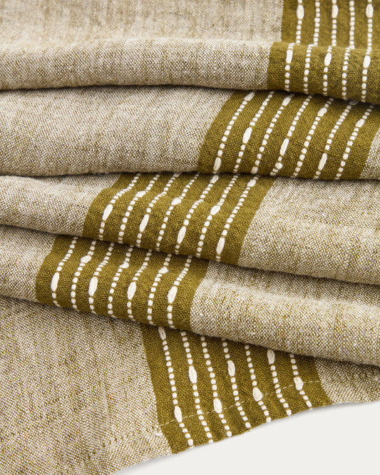 Chemin de table Calena en jacquard de lin avec bande centrale verte 50 x 150 cm