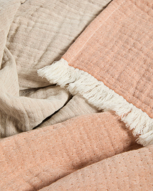 - Couverture en gaze 100 % coton bicolore avec franges.