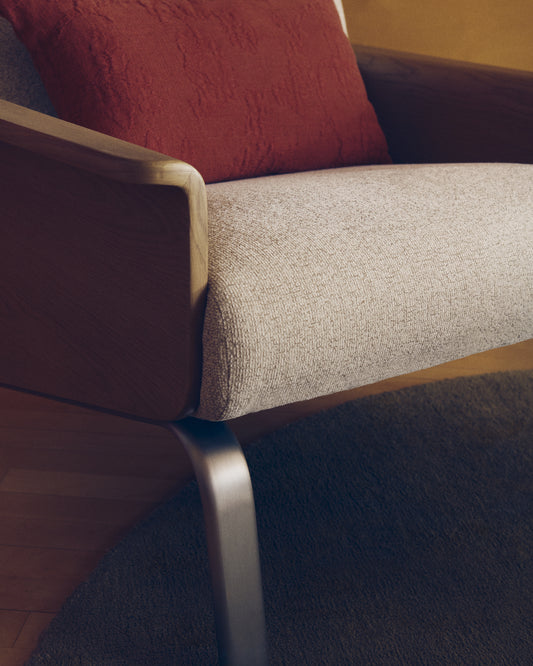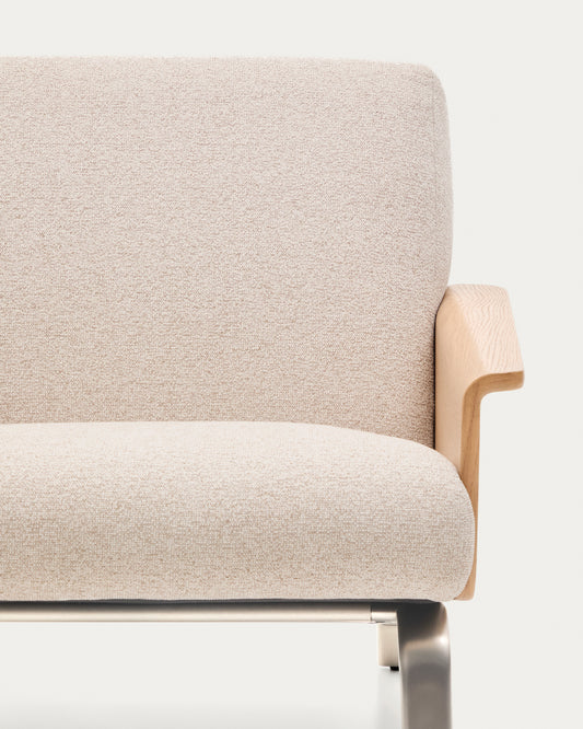Fauteuil Amsen beige en contreplaqué de chêne avec pieds en acier inoxydable brossé