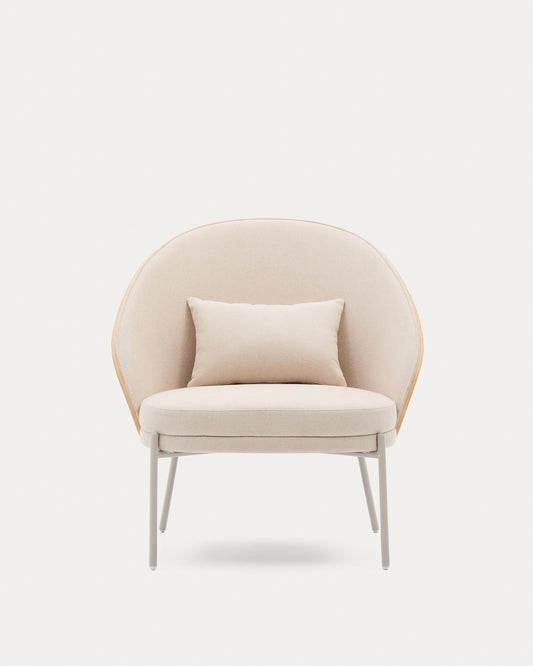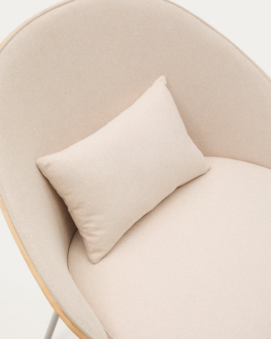 Fauteuil Eamy en chenille beige, placage de frêne avec finition naturelle et métal beige