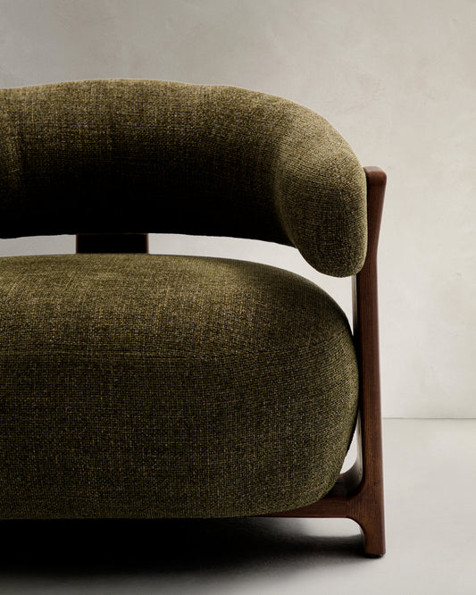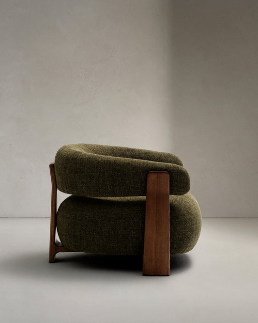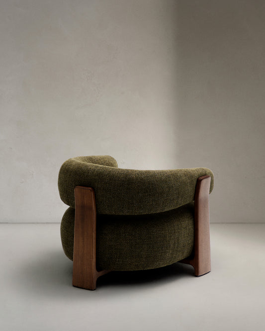 • Fauteuil en tissu chenille en polyester recyclé épais, vert bicolore et pieds en bois de frêne finition noyer.