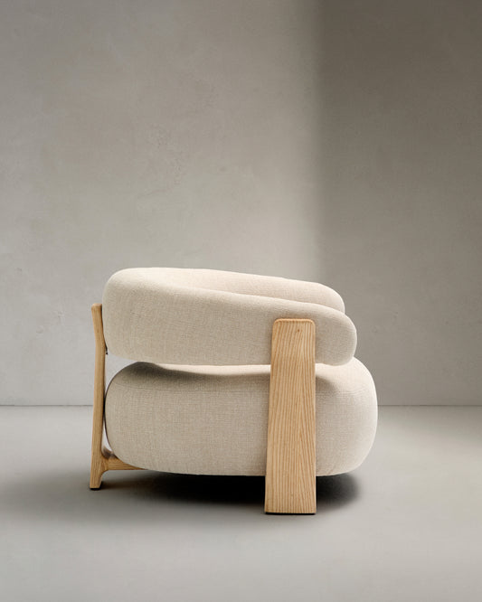 - Fauteuil en tissu chenille en polyester recyclé épais, beige bicolore et pieds en bois de frêne finition naturelle.