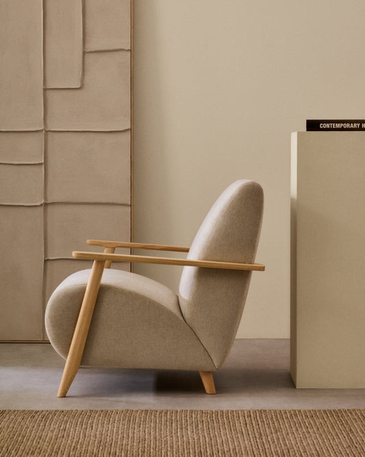 Fauteuil Meghan en tissu chenille perle et bois de frêne finition naturelle FSC Mix Credit