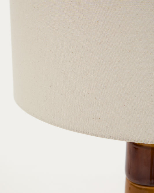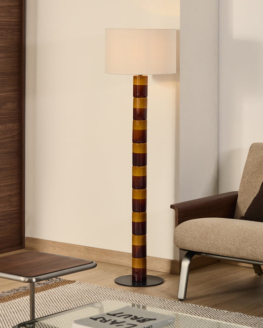 Lampadaire en Mavran avec pied en céramique couleur marron et moutarde et abat-jour en coton
