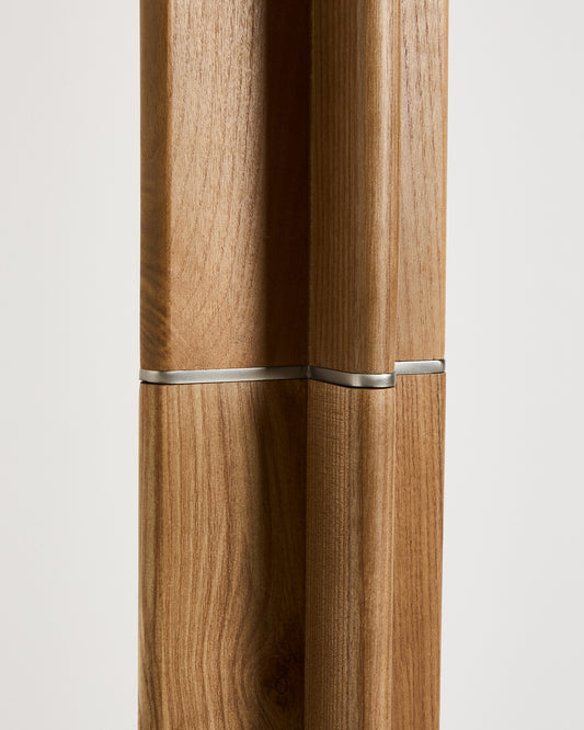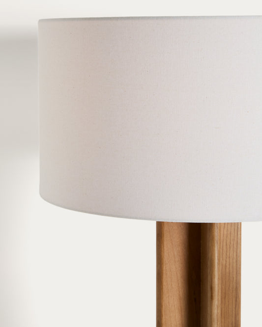 - Lampadaire en bois d’hévéa avec abat-jour en coton.