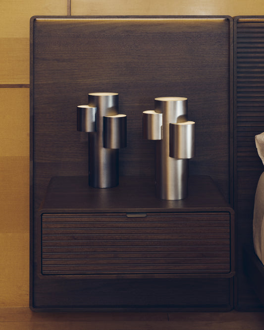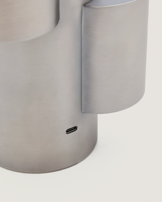 - Lampe de table LED portable en métal gris avec finition brossée.