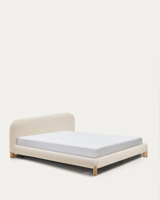 Lit déhoussable Odina en tissu bouclette écrue et pieds en bois de frêne avec finition ton naturel pour matelas de 180 x 200 cm
