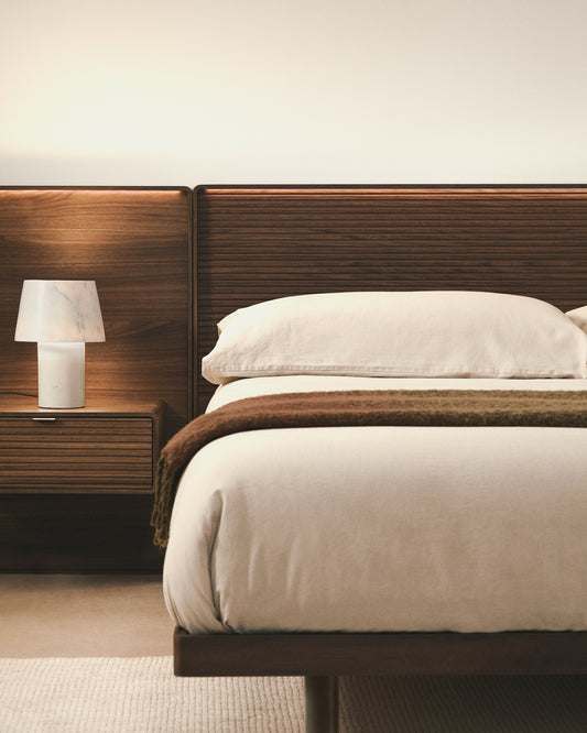 - Lit avec tête de lit et deux tables de chevet en placage de noyer avec fraisage linéaire horizontal et bande lumineuse LED en partie supérieure.