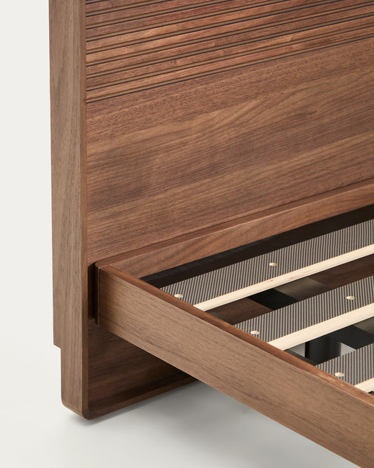 - Lit avec tête de lit en placage de noyer avec fraisage linéaire horizontal et bande lumineuse LED en haut.