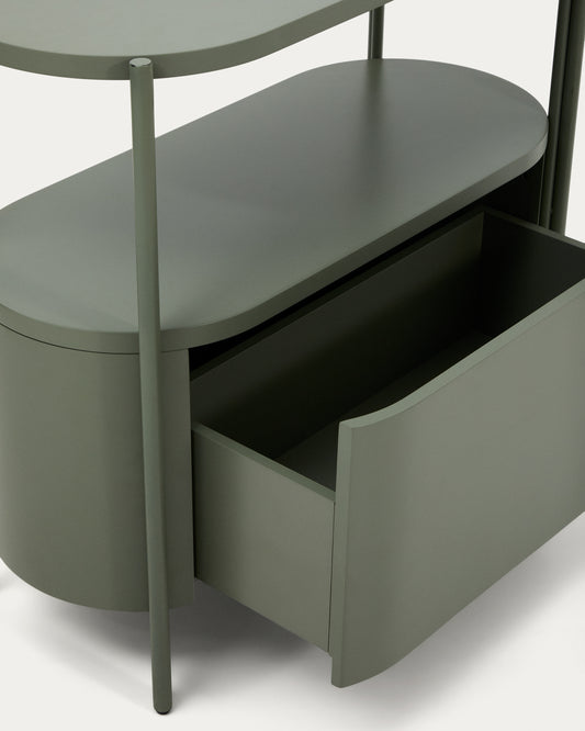 Ce meuble de salle de bains associe des formes douces et des volumes simples pour créer un espace fonctionnel et accueillant. Ce modèle conçu en exclusivité par Nahtrang pour Kave Home est doté d’angles arrondis qui contribuent à un confort optimal, permettant une interaction fluide au quotidien. La combinaison de la structure en acier et du corps en MDF hydrofuge laqué assure solidité et stabilité, tout en offrant une finition raffinée qui s’intègre harmonieusement à tous les styles de salle de bains. Le tiroir coulissant, avec ouverture par pression et fermeture amortie, offre un accès simple pour l’organisation de vos objets, assurant ainsi une utilisation pratique et une salle de bain toujours bien rangée. Les pieds réglables garantissent une stabilité optimale, même sur des sols irréguliers. Il est conçu sans trou pour le passage de la robinetterie, pour que vous puissiez positionner le lavabo où vous le voulez, selon vos préférences et vos besoins. Chaque détail de ce meuble a été pensé pour qu’il soit à la fois fonctionnel et durable, tout en s’intégrant parfaitement à l’espace, où il crée une ambiance agréable et sophistiquée. Une pièce conçue pour ceux qui recherchent un design pratique et fonctionnel dans la salle de bains.