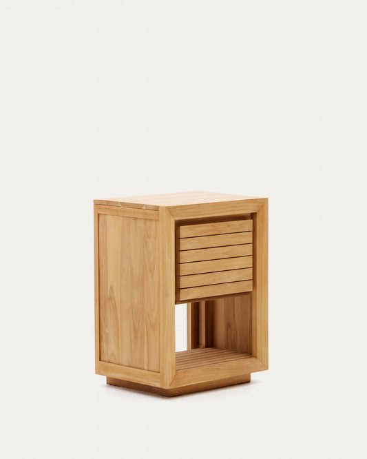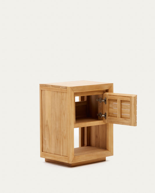 • Meuble de salle de bain en bois de teck finition naturelle avec une porte.
