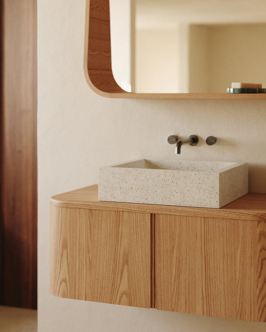 - Meuble de salle de bain en contreplaqué de frêne avec finition naturelle.