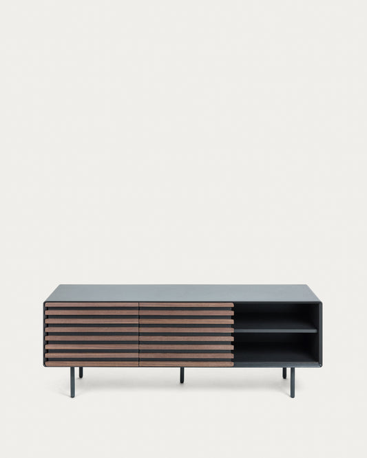 Le meuble TV Kesia en placage de noyer sera votre meilleur allié déco et rangement. Les lignes épurées et droites de ce meuble TV ainsi que le contraste de la couleur mat graphite de sa structure avec ses portes coulissantes font la particularité de cette pièce.