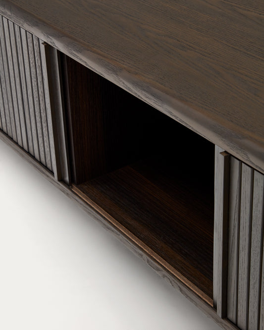 - Meuble de TV fait en placage de frêne avec finition foncée.