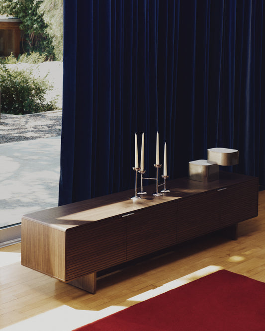 - Meuble TV en placage de noyer de 0,6 mm d’épaisseur. 4 portes avec charnières à fermeture amortie et étagères réglables pour ajuster l’espace de rangement.