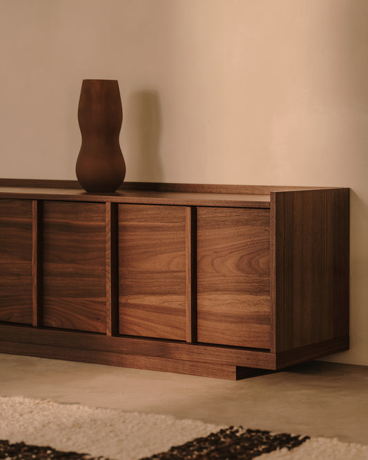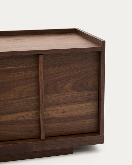 • Meuble TV en placage de noyer, finition foncée.