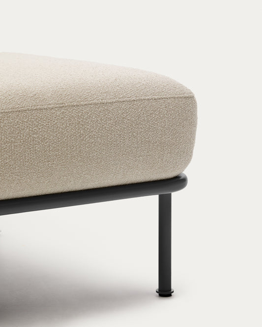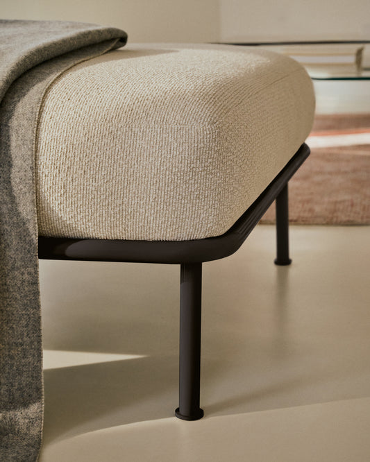 - Repose-pieds tapissé en chenille écrue à petite structure et au toucher doux. Base en métal avec finition microtexturée mate.