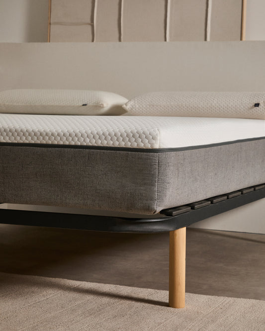Le sommier Talo est conçu pour offrir stabilité, résistance et confort chaque nuit. Sa structure métallique en acier laminé est recouverte d’une peinture en poudre de couleur graphite qui assure une plus grande durabilité et une protection contre la corrosion. Le cadre renforcé, en tubes de section rectangulaire de 40 x 30 mm, offre un support solide et stable au matelas. Les lattes en contreplaqué de bouleau, très flexibles, sont recouvertes d’une couche décorative de couleur grise et sont conçues pour s’adapter aux mouvements du corps, améliorant ainsi la répartition du poids et le confort. Elles sont fixées au moyen de supports en polyéthylène qui minimisent les bruits et amortissent les impacts, assurant ainsi un sommeil paisible et sans interruption. Chaque sommier est constitué de 6 lattes de 17 cm de large, disposées de manière à offrir un équilibre parfait entre fermeté et adaptabilité. Par ailleurs, ce sommier est compatible avec nos lits sans sommier et il peut être agrémenté des pieds Lyx ou Ise, disponibles séparément. Une pièce robuste et polyvalente, conçue pour améliorer la qualité du repos et s’adapter à n’importe quelle chambre.