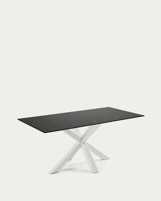 Table Argo en verre noir mat et pieds en acier finition blanche 200 x 100 cm