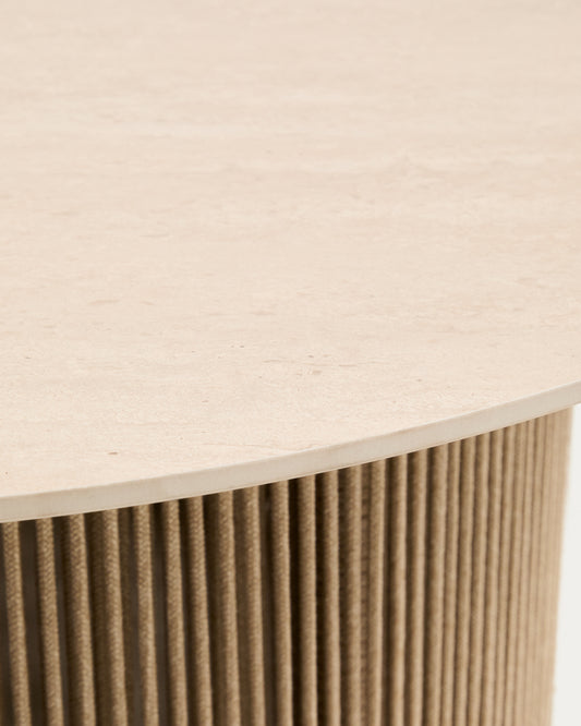 Table basse d’extérieur Orosei en pierre frittée, aluminium couleur écru et corde beige Ø 90 cm