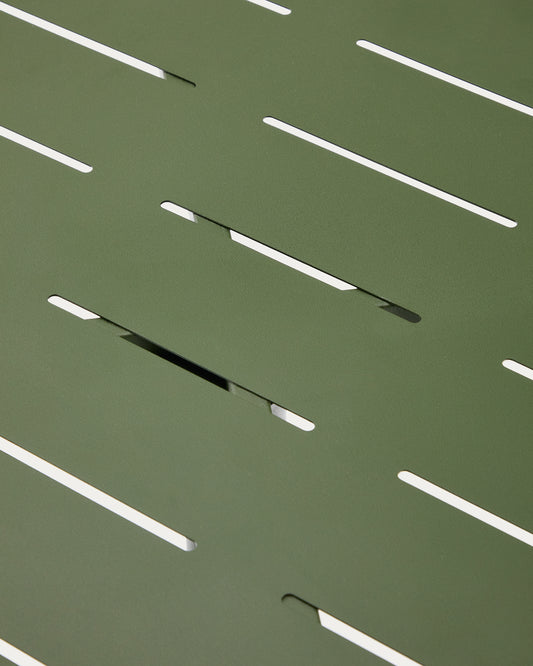 - Table d’extérieur en acier galvanisé avec finition en couleur verte. La base renforcée par du ciment apporte une meilleure stabilité.