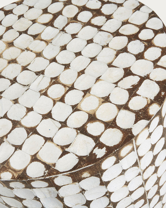 - Table d'appoint de Ø 40 cm conçue en bois de manguier naturel recouvert de coquilles de noix de coco peintes en blanc.