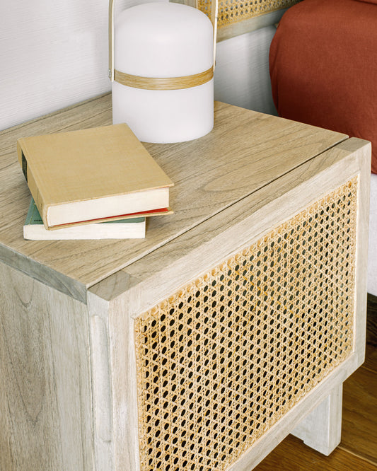 - Table de chevet de 50 x 48 cm en contreplaqué et bois de Mindy, aux tons et veinures uniques, avec porte en rotin tressé à la main.