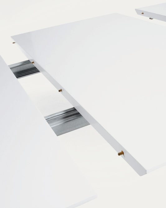 - Table extensible avec plateau rectangulaire 140 x 100 cm en mélaminé avec finition blanche et pieds en bois massif de frêne