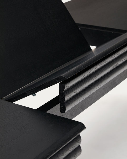 - Table extensible avec plateau en placage et pieds en bois de chêne, finition teinture noire.