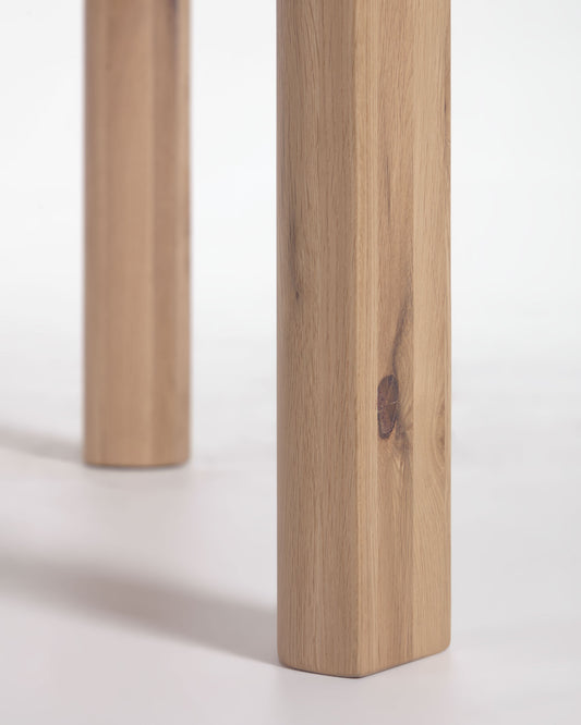 - Plateau en contreplaqué de chêne et pieds en chêne réglables.