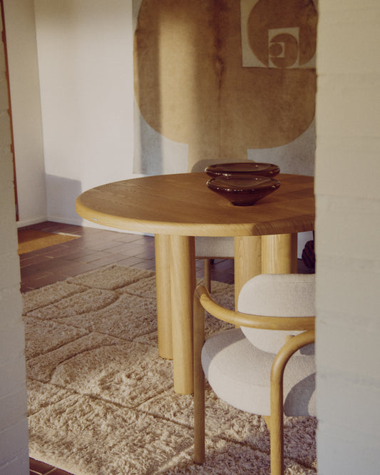 - Table ronde faite en contre-plaqué de frêne avec finition naturelle.