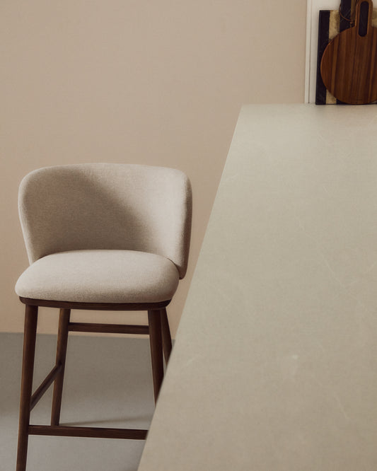 Tabouret Ciselia en chenille épaisse beige et pieds en bois de frêne avec finition ton noyer FSC Mix Credit 65 cm