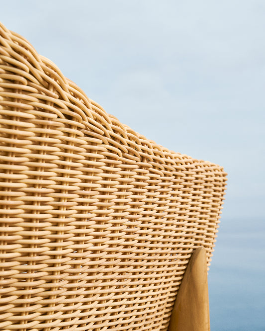 La collection Galea, conçue par Made Studio pour Kave Home, est un hommage à l’artisanat traditionnel adapté aux besoins d’aujourd’hui. Chaque pièce est une combinaison parfaite de design exclusif et de fonctionnalité, créée pour durer et pour s’intégrer harmonieusement dans tout espace extérieur ou intérieur. Le bois de teck certifié FSC™ 100 % garantit non seulement un engagement en faveur de la durabilité et de la gestion responsable des forêts, mais apporte également une chaleur naturelle qui rehausse la beauté de chaque pièce. Le rotin synthétique tressé à la main, imitant l’osier, assure une résistance exceptionnelle aux intempéries et une grande facilité d’entretien. Le confort et la commodité sont au cœur de cette collection. Les coussins déhoussables sont dotés d’une mousse réticulée qui permet à l’eau de traverser le coussin sans être retenue à l’intérieur pour un séchage rapide, ce qui les rend parfaits pour un usage en plein air. Pour préserver l’essence de ces pièces dans le temps, nous recommandons d’appliquer le protecteur de bois Sterina au moins deux fois par an.