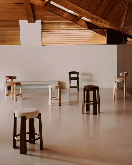 - Tabouret tapissé de tissu chenille bicolore épaisse en polyester recyclé.