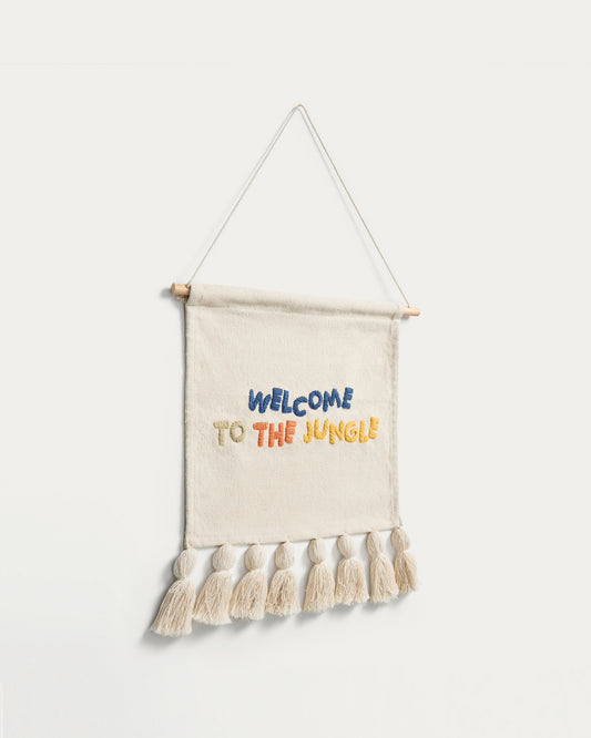 - Tapisserie en coton beige avec lettres multicolores et franges.