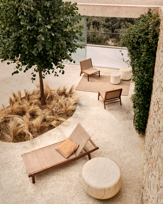 - L’assise et le dossier sont en rotin synthétique tressé à la main. Il imite l’aspect naturel de l’osier tout en étant résistant aux intempéries et facile à nettoyer.