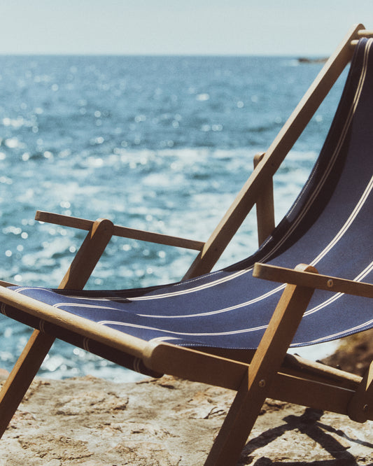 Transat pliable d’extérieur Vilara rayures bleues et beiges en bois d’acacia FSC 100 %