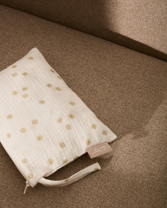 - Trousse de toilette 100 % gaze de coton de couleur terracotta.